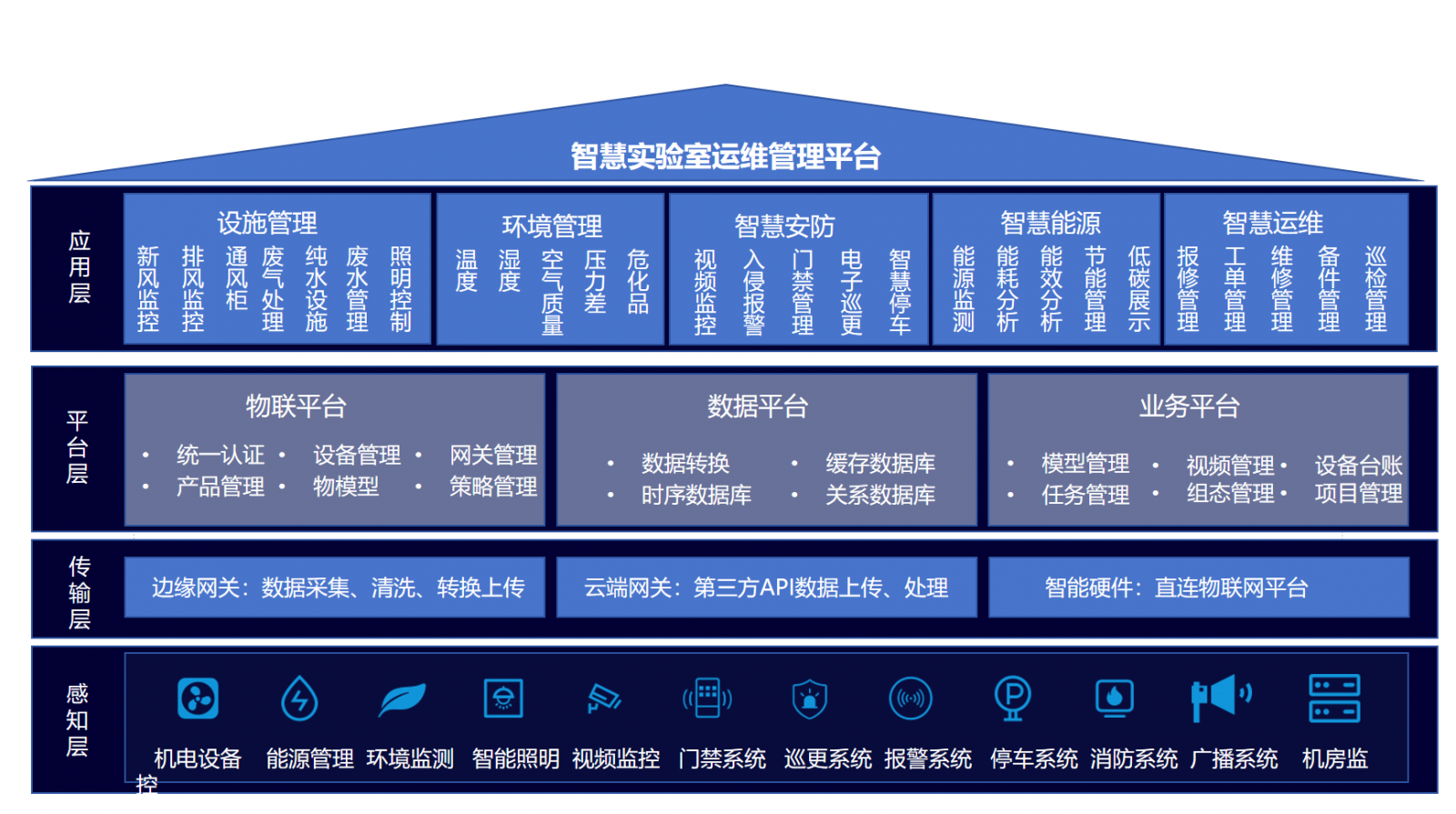 智慧实验室运维管理平台(Smart Laboratory Operation & Maintenance Management Platform,简称GH-LMP)是一套专为现代化实验室设计的综合性智能化运维管理系统。平台以"保障安全、提升效率、降低能耗、规范运维"为核心目标,通过物联网(IoT)、大数据分析、三维可视化和移动端协同技术,实现对实验室各类设施设备、环境参数、安防系统及能源使用的全流程、全时段、全要素集中监控与智能运维管理。