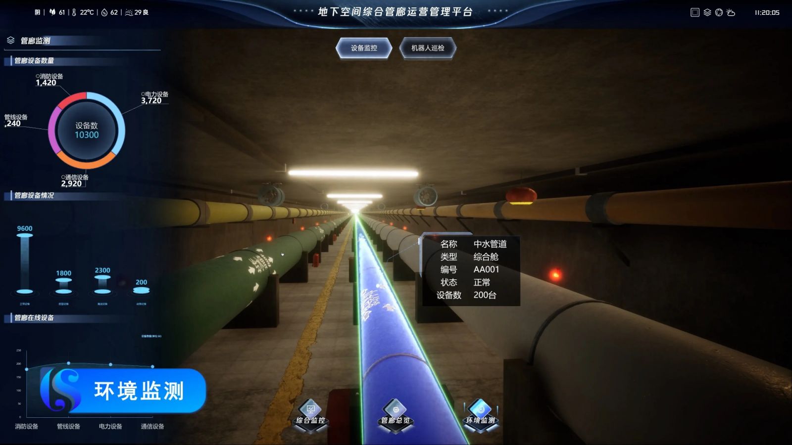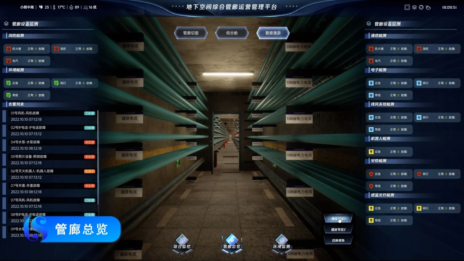 综合管廊作为城市地下空间的“生命线”工程,集中承载电力、通信、燃气、给排水等市政管线,是保障城市安全运行与民生服务的关键基础设施。然而,传统管廊运维面临环境复杂(多舱室、管线密集)、风险隐蔽(有害气体积聚、设备隐性故障)、管理低效(依赖人工巡检、响应滞后)等痛点,亟需通过智能化手段实现全要素精准管控。